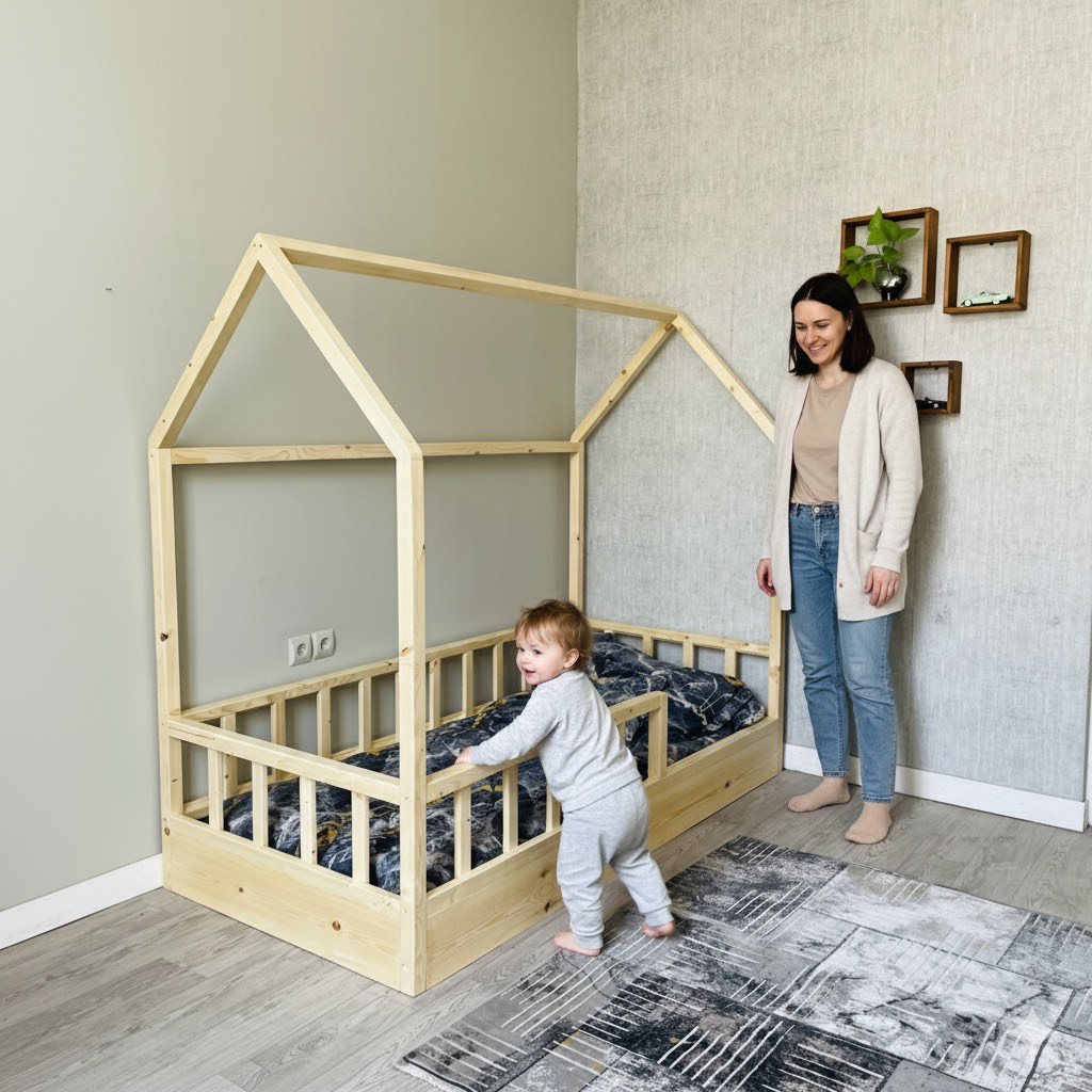 تختهای کلبهای (House Beds) یکی از محبوبترین اشکال تختهای مونتهسوری هستند که علاوه بر اصول استقلال، به نیازهای روحی کودک نیز پاسخ میدهند. این تختها با قاب خانهمانند چوبی، یک فضای منحصر به فرد ایجاد میکنند.